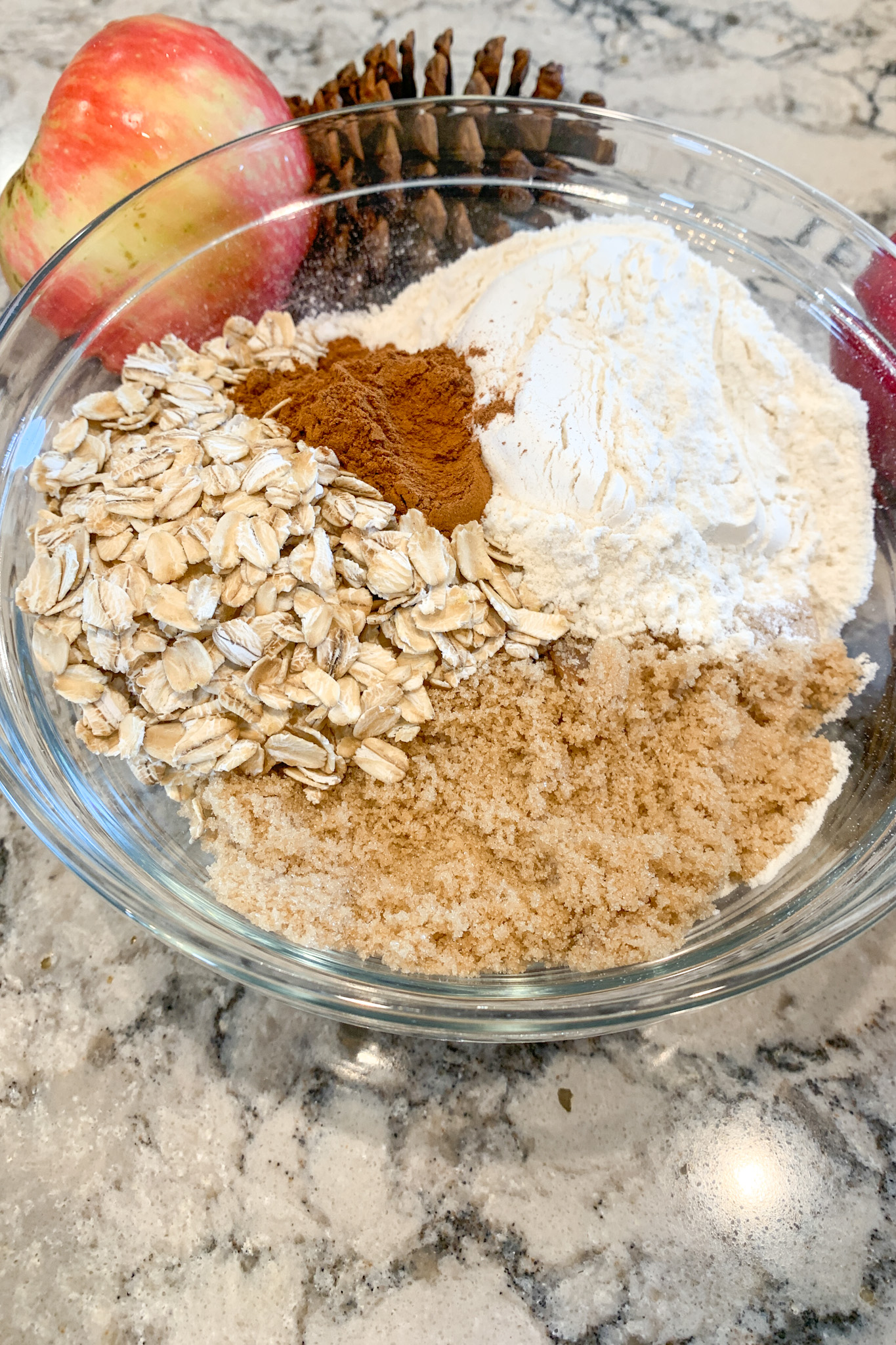 Mix all of the dry ingredients: flour, brown sugar, oats, and cinnamon in a medium size bowl. Work in the cubed butter with two forks or a pastry cutter until small clumps of butter are coated in the dry mixture. Spoon over the apples in the cast iron skillet or dish of your choice.